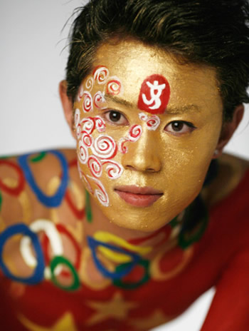 用金色涂满整个脸作为底妆,奥运的一个大标志贴在额头中间蛮有创意的奥运妆容。