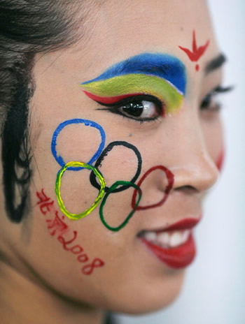 这个妆容很有趣,把五环画在脸上,在眼妆上画上五环的色彩,眉毛用的是蓝色,眼影用的是黄色,眼线采用了双色分别是黑色和红色,不错,小编觉得这个很有创意。