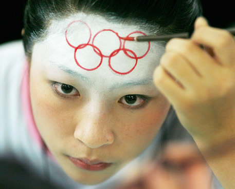 这个美眉很可爱,自己用红色画五环在额头上,还用白色涂满整个额头。
