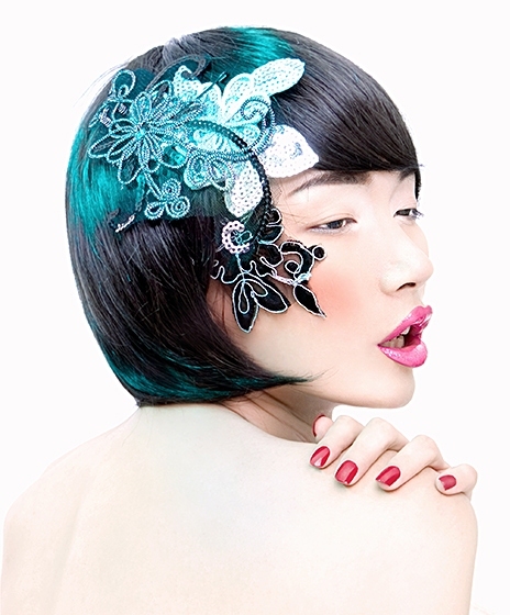 复古的蝴蝶头饰,艳粉的唇色,已经深红的指甲,唯美中的另类