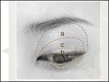 在a区域涂上底妆,也就是颜色稍浅一点的眼影,可以起到高光的效果。在b区域涂上颜色稍深的棕色眼影,最好是带有珠光或者亮片的闪亮眼影。在c区域涂上浅棕色眼影或者橙色眼影,加深眼妆的自然效果。