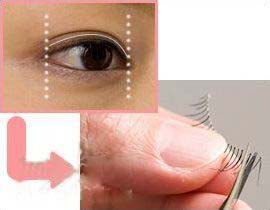 首先画完眼影,用夹子很轻的将假睫毛夹住,提高卷度,先不用胶水试着粘在眼皮上,看假睫毛的长度是否合适,以图中白色弧线所显示的为准,超出部分用小剪子修整好。