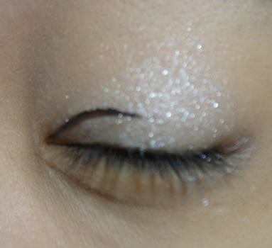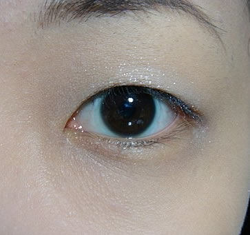 一:先上眼影到眼折上面(预定眼线位置的上方),因为使用白色珠光眼影,会有膨胀效果,所以只要上到眼线上方位置,这样眼线以上的眼皮颜色会因为比较暗而有凹下去的感觉,也比较不会抛.