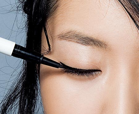 眼线液必不可少,黑色眼线液最能使眼睛看起来明亮。从眼头到眼尾,沿睫毛根部描画。