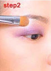 step1:以紫色系眼影在眼窝打底,越接近双眼皮的地方颜色越深,往上轻轻推开,做出晕染的效果。