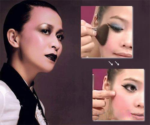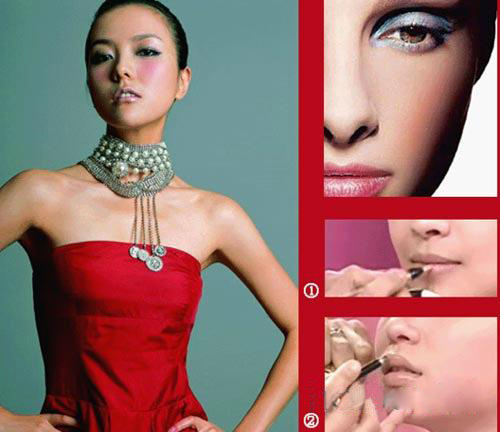 用含有大少不同颗料的粉饼,轻扫上面颊,以突出面部轮廓。唇红腮红用大号扫,从两边鼻翼往眼尾轻拉,使脸型显瘦,T区打上闪粉,增加光亮度和立体感,再以滚筒亮片修饰,达到从不同角度折射出不同的光泽的效果。
