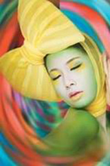 眉眼:用黄色眼影粉沿自然眉型轻扫,上下眼睑用黄色和绿色搭配晕染。下眼影的晕染有与腮红合二为一的妙用。