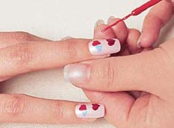 step2 用2(彩色针管指甲油)画出不同颜色的心形图案。