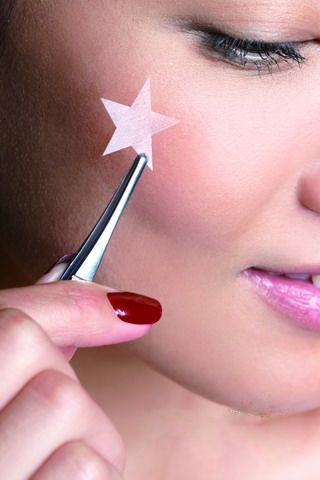 制造肤色差的造型效果其实一点都不难,用一面有粘性的纸片剪出你想要突出的图案,然后贴在脸上,再大面积涂抹颜色就对了!最后,小心地把纸片揭下来,大功告成!大概唯一需要费点神的,就是像小时候做手工一样准备纸片。告诉你秘诀:用电脑画五角星,然后用单面胶纸打印出来!——揭下来的沾满颜色的小纸片,完全可以贴在指甲或身体其他部位,可和脸上的妆效呼应得天衣无缝,妙!