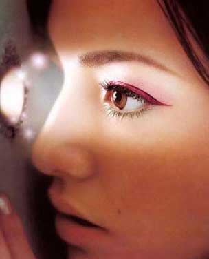 2 单眼皮时的化妆,画眼线的重点应在下眼线。从外眼角开始描下眼线,逐渐加宽,至1/2处停止,眼线应略微延伸出眼尾。可以不画上眼线,或用点画法在上睫毛根部画,不要刻意强调上眼线。