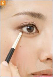 6、然后用眼影刷沾取一点浅棕色的眼影,涂在下一眼睑靠近眼尾的地方。