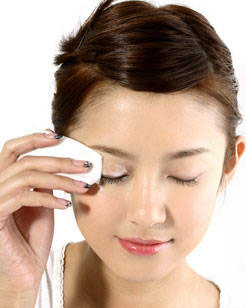 滴一点卸妆液到化妆棉上,然后闭上双眼,依眼皮的肌理,由眼头向眼尾方向慢慢抹去;抹下眼线位置时双眼向上望。尽量避免过度拉伸眼部肌肤产生细纹。