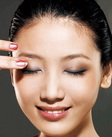 将金属光泽的银灰色霜状、膏质的眼妆品,用指腹均匀薄透地在上眼睑推开,直至眉骨下方呈半月型。
