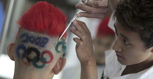 随着北京奥运离我们越来越近,冰城市民也在用自己的方式表达着对奥运的深深祝福。3日,26岁的冰城理发师阿仁正在对自己创作的奥运发型进行最后的精雕细刻,这个包含了奥运五环、2008、中国(china)等元素的发型经过推、刻、漂、染、剪五道工序,历时三天完成,头顶的红发象征着熊熊燃烧的奥运火炬。