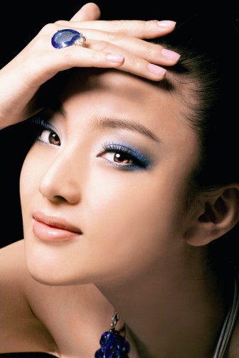 彩妆提示:蓝色的眼影直接使用会呈现绿色的感觉。因为亚洲人属于黄色皮肤,所以,可先选用珍珠白的眼影涂在眼周围。宝石蓝的眼影由眼尾向眼角和眉骨处过渡,眼尾处的颜色最深。最后,在睫毛梢上,用蓝色的睫毛膏做少量的点缀,可以起到“画龙点睛”的作用。