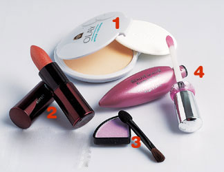 4、将浅金色唇膏和粉色调唇彩混合涂抹在唇上,让唇色与整体眼妆相呼应。