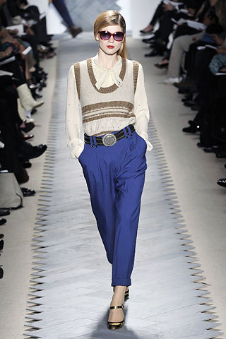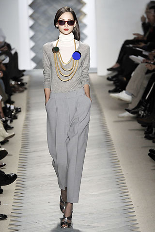 08年秋冬系列以黑灰金为主色调,用面料的光泽感来打造高贵华丽的气息。亮缎面料几乎用在了所有的服装款式上,裤子、裙装、外套等等,一股复古的气息扑面而来。裤装与裙装的腰线都有所提高,更增加了复古的气质。镂空和透明纱质面料也越来越受到欢迎,与正统的西装,外套等搭配,既性感,又不失风度。