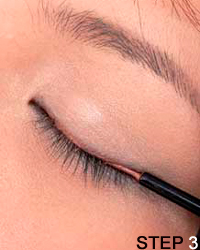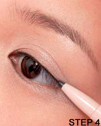 STEP 4:画上眼线 贴合着睫毛根部描画眼线,在眼尾处画出眼线上扬的效果。