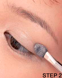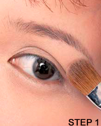 STEP 1:打亮眼窝 使用带珠光的粉底打亮眼窝,便于上眼影色并使色彩更鲜明。