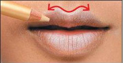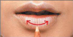 1、M型线条是唇形完美的重点。在唇峰的M线部分,用裸金色唇线笔,顺着M型修饰,制造明亮的嘟唇效果。