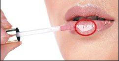 4、顺着唇形,均匀以唇笔沾取唇膏涂满。最后在下唇的中央点上带有珠光宝石效果的唇蜜。