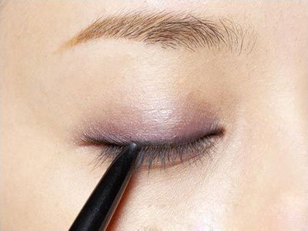 步骤1、涂上眼影之后,把眼线笔在睫毛根部仔细画一条细细的眼线,使颜色填满睫毛之间的空隙。然后再用棉棒把眼线稍稍晕染开。