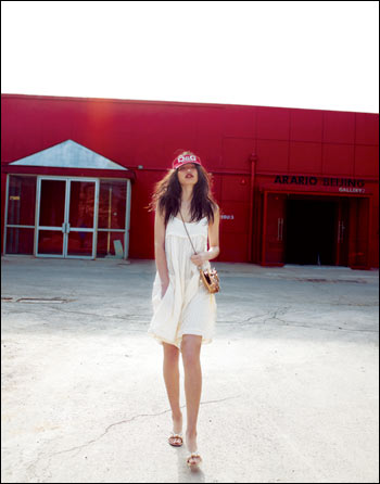 品牌:白色吊带裙裤 ISABEL MARANT (I.T) 红色运动遮阳帽 D&G (I.T) 棕色斜背小包 COOCO (i.t)