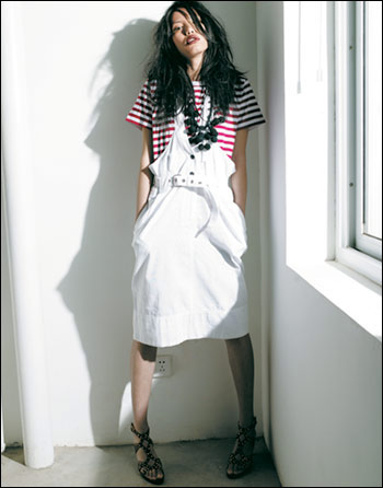 品牌:红色条纹T恤 agnes b. 白色背带裙 MARC JACOBS 钉扣装饰凉鞋 JC