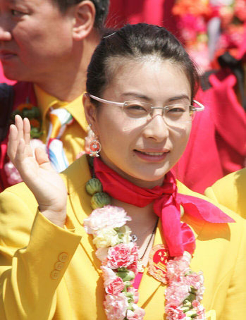 “跳水皇后”郭晶晶格外引人注目:名牌眼镜、钻石耳环,还有她颈上的花环、项链及红色的围巾,与其他代表团成员形成强烈对比。