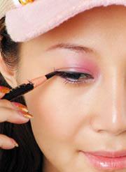 step3: 选深粉色涂在双眼皮皱褶处,然后用带有珠光效果的淡粉色眼影向上晕染涂抹;