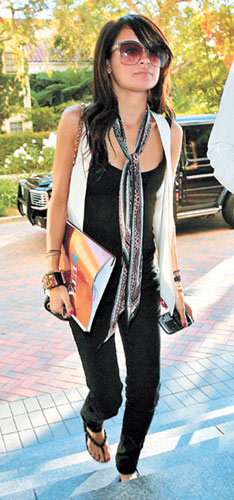 Nicole总能用出色的单品为自己的装扮加分。背心搭配开衫,被花色特别的丝巾加入新的构思,精致的挎包和太阳镜是不可缺的点缀。