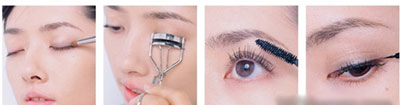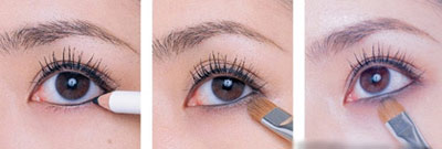 7.再以眼线笔或深色眼影加强黑眼珠的上下中央处,就会有瞳孔放大片的效果。