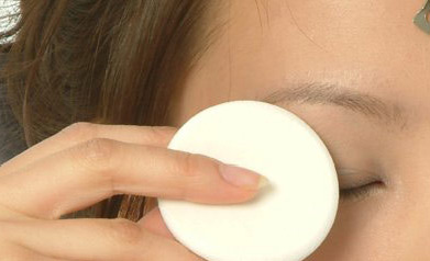 粉扑取适量的散粉,在眼部先按压定妆,能使眼影持妆时间更长,还能使妆容干净不出油。
