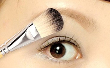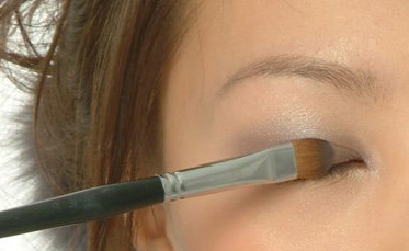 选取浅色的眼影,先从眼中处下笔,然后向两边匀染。