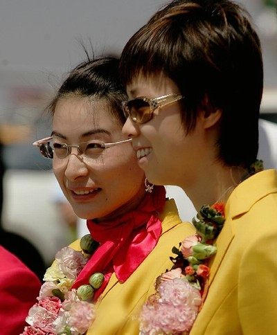 2008年8月29日 (体育)(9)国家奥运金牌运动员代表团抵港 8月29日,中国选手郭晶晶(左)与张怡宁在欢迎仪式上。当日,在北京奥运会上获得佳绩的国家奥运金牌运动员代表团抵达香港,展开三天访港行程,与香港市民交流并进行公开示范表演。