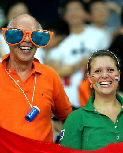 育场进行。一位荷兰球迷带着一副巨型眼镜在比赛现场观看比赛。