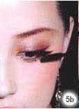 5.深金棕色眼影棒抹在下眼睑尾部呼应整体眼妆色彩。涂上浓密睫毛膏,反复仔细地刷上2~3层制造丰盈的睫毛效果。
