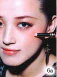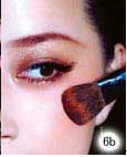 6.使用接近肤色的粉红色胭脂涂在颧骨较高的位置,并用腮红刷扫开。 另外,如果使用的是亮片粉末,建议在眼皮的地方先搽上一些唇蜜,只要上薄薄一层就好了,然后轻轻地将亮片撒在眼皮上,或是用眼影刷沾上去,如此一来不仅有唇蜜油亮的效果,亮片也可以紧密附着在眼皮上。