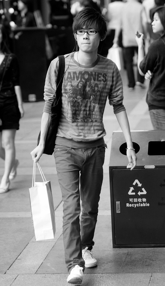 这一身够鲜艳,不过架上一副黑框眼镜倒文气了不少。皮肤白净的男生似乎很爱这一招。