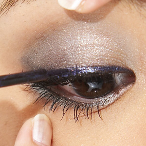 1.画好眼影后,从眼头的睫毛根部开始画亮片眼线(手指往上拉开眼头)