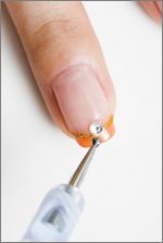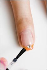 于上一步骤的指甲油尚未全干时,于线条的中央置入一颗简单的大钻,让甲片更加耀眼。