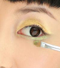 STEP2 明黄色眼影横扫在贴近下眼线的位置,日常妆选择下眼影的原则就是要与上眼影色调和谐,不可反差过大,并避免浓艳的颜色。