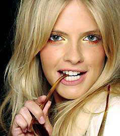 看今年秋冬T台上的模特,大都带着一张特别白而无瑕、似乎没有经过化妆的脸,国际彩妆大师东田顶级造型师表示2006年的时尚界,从T台到街头都在力图回归自然,对“自然光泽”的灵活把握是重中之重。当深深的晒伤妆和闪亮的棕色肌肤不再流行时,一张自然白皙的脸才是独一无二的新潮之作。因此,用轻薄的粉底和散粉混合后,再创造出柔滑、无瑕的妆效。色彩多以裸白、鲜肉色、乳白色、浅米色为主。MaxFactor彩妆师介绍,可以尝试色彩柔和的粉霜,让肌肤不感到干燥,上妆更加贴服,定妆的时候不能刷太多蜜粉,万一多了,可以用大号化妆刷刷去多余的粉,这样出来的妆容才符合时尚的标准。