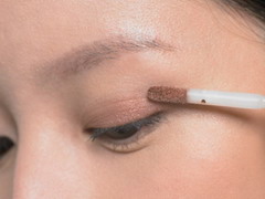 涂上最深的褐色 强调上眼眶 视线一样往下看,沾抹最深的褐色后,直接沿着刚刚上过霜状眼影的位置重复描绘一遍,在这边要注意,位置拉到眼尾时,要往后延长一点点才收尾。