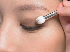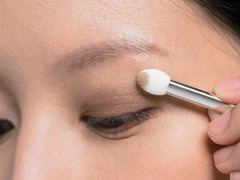 卡其色向上塑造晕染渐层 以海绵棒沾上卡其色眼影粉,抖落几下让粉均匀沾在眼影棒上,从眼球中央呈ㄑ字向上来回晕染,大约至2/3眼窝高度,重复涂刷让褐色的层次更分明。