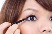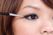 4、双眼皮女孩要创造大眼效果,最需要强调的是眼型的轮廓,因此,可利用色感浓黑的眼线胶将眼睛的上下内眼线都描绘上去,再特意强化眼尾的拉长线条,眼睛绝对可以无限放大。