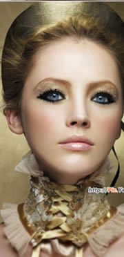 还是选择金黄色的眼影色彩,连眉毛都用了棕色的代替金黄效果。浓郁的眼妆非常的明亮。