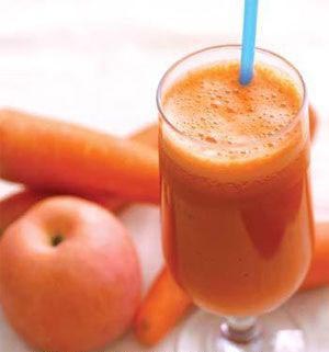 1.将适量的苹果 胡萝卜 菠菜和芹菜切成小块(段) 加入牛奶 蜂蜜 少许冰块 用果汁机打碎 制成营养丰富的果蔬汁