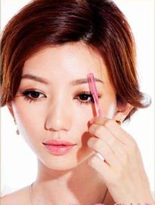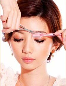 用眉梳向上梳理眉毛,剪短,定好眉头形状,并用眉刀修好眉尾。