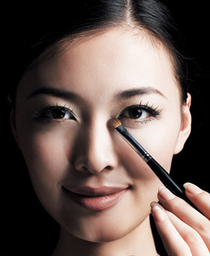 选含闪光颗粒分子的眼影粉从眼角开始涂抹,浓郁度按前重后轻的比例来分配,晕染范围在1/2 眼窝以内,别忘记下眼尾也要描涂。